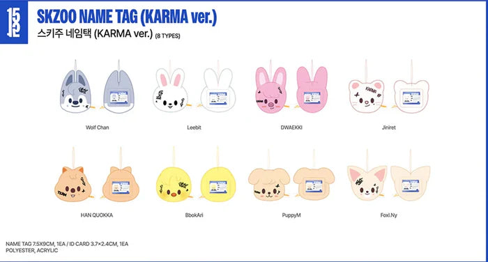 El MD [KARMA] (NAME TAG) de Stray Kids es un artículo oficial diseñado para fans que aman llevar siempre un detalle del grupo. Este set incluye un colgante de etiqueta de nombre SKZOO y una tarjeta ID exclusiva, perfectos para personalizar tu mochila, estuche o colección de merch de la era KARMA.